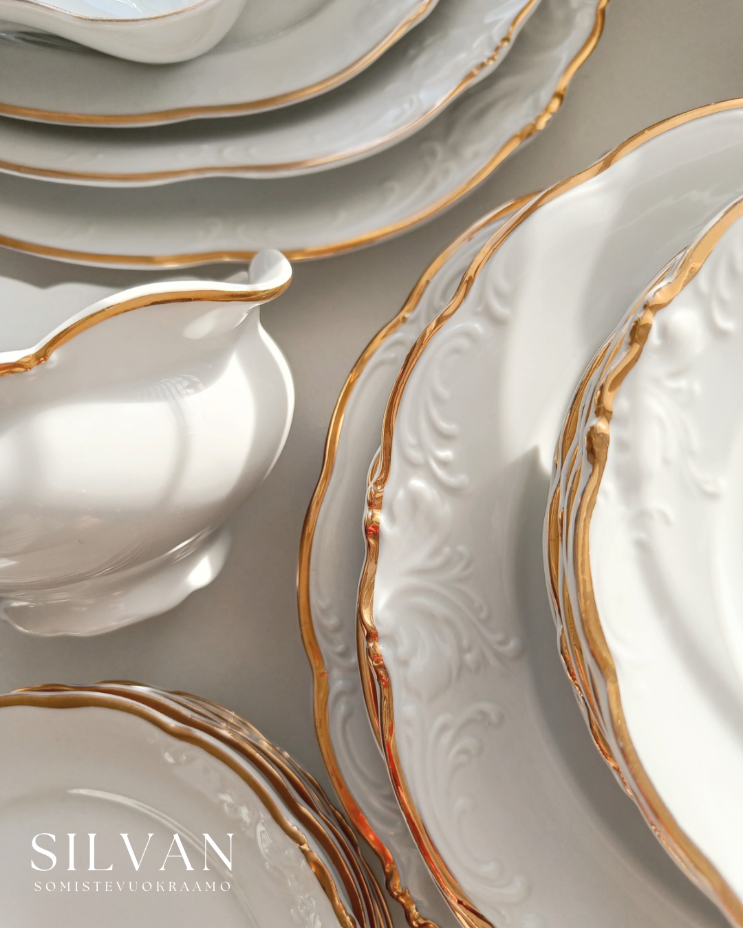 Valikoimamme kasvaa vähitellen – juuri nyt saat meiltä vuokralle valkoisia ja beigejä kangasservettejä, viini- ja viskilaseja sekä posliinilautasia. Muiden kattaukseen liittyvien tarvikkeiden osalta voit kääntyä yhteistyökumppaneidemme puoleen.