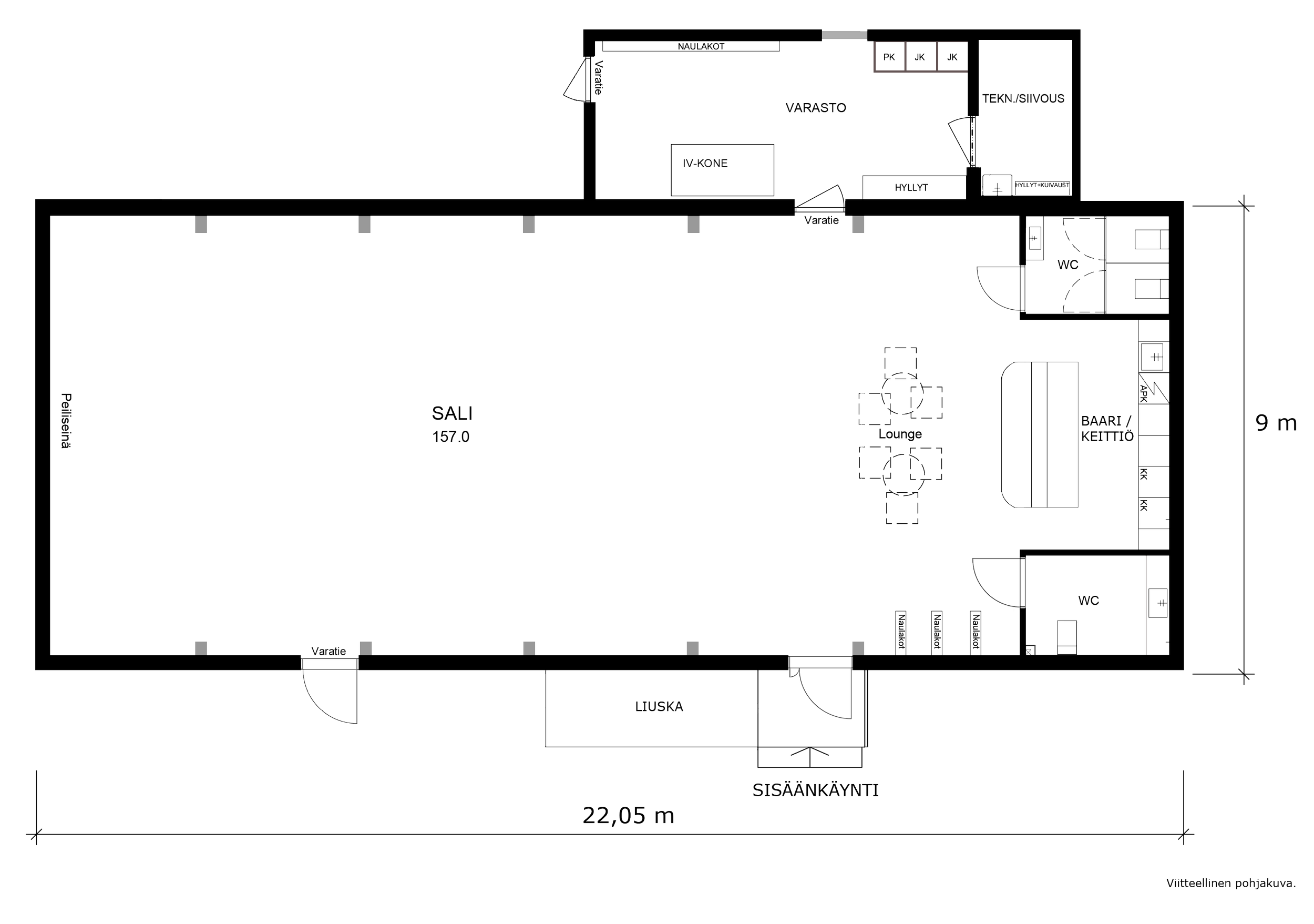 • 185 m², josta yhtenäistä juhlatilaa 157 m² (9 x 17 m)